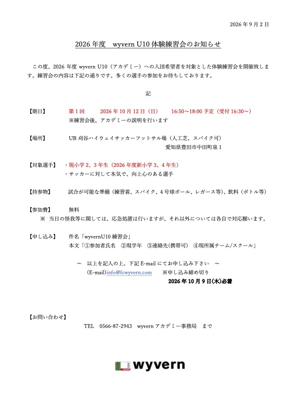 2026年度に向け、新U10(4年生)の選手募集を行います。