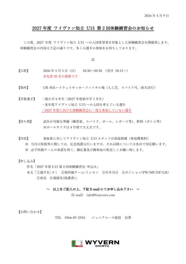 2027年度に向けて、新ワイヴァン知立 U15(現小学6年生)への入団希望者を対象とした「体験練習会」を開催致します。