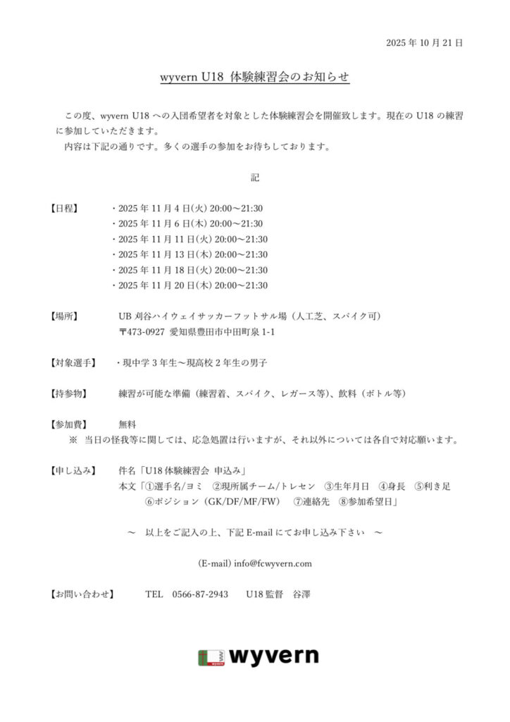 wyvern U18 体験練習会のお知らせ